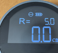 左ボタンを押すごとに、画面の上のバッテリーの左側の表示が変わります。通常はーーですが、測定対象の両側に枠がある場合、片側に枠がある場合など、見た目でわかるようになっています。円の中に横棒の表示になっている場合は、円周上の長さを測定することで、その直径が表示されるようになっています。「R=」のところに表示されるのが直径です。今のところ、使う機会はありませんが。